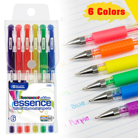 BAZIC 6 Fluorescent Color Essence Gel Pens w/ Cushion Grip Sold in 24 Units
