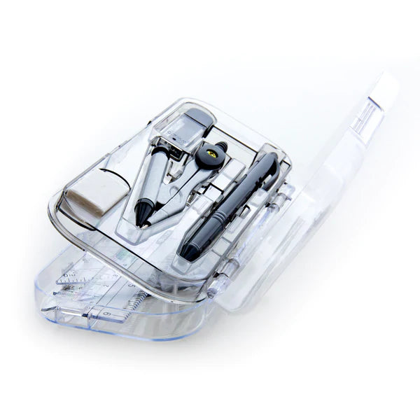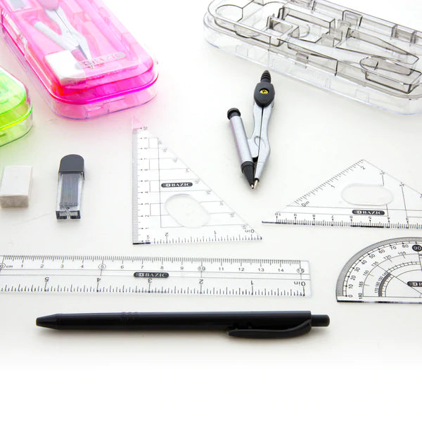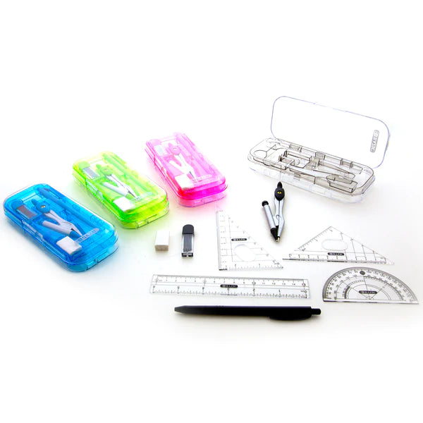 - MATH GEOMETRY KIT 9 PIECES. 180 degree semicircular protractor + 30/60/90 Degree Triangle Ruler+ 45/90 Degree Triangle Rulers + Compass with 0.7 mm mechanical pencil + Lead Fill + Ruler 6" (15 cm) + Eraser + Pen + Portable Transparent Case