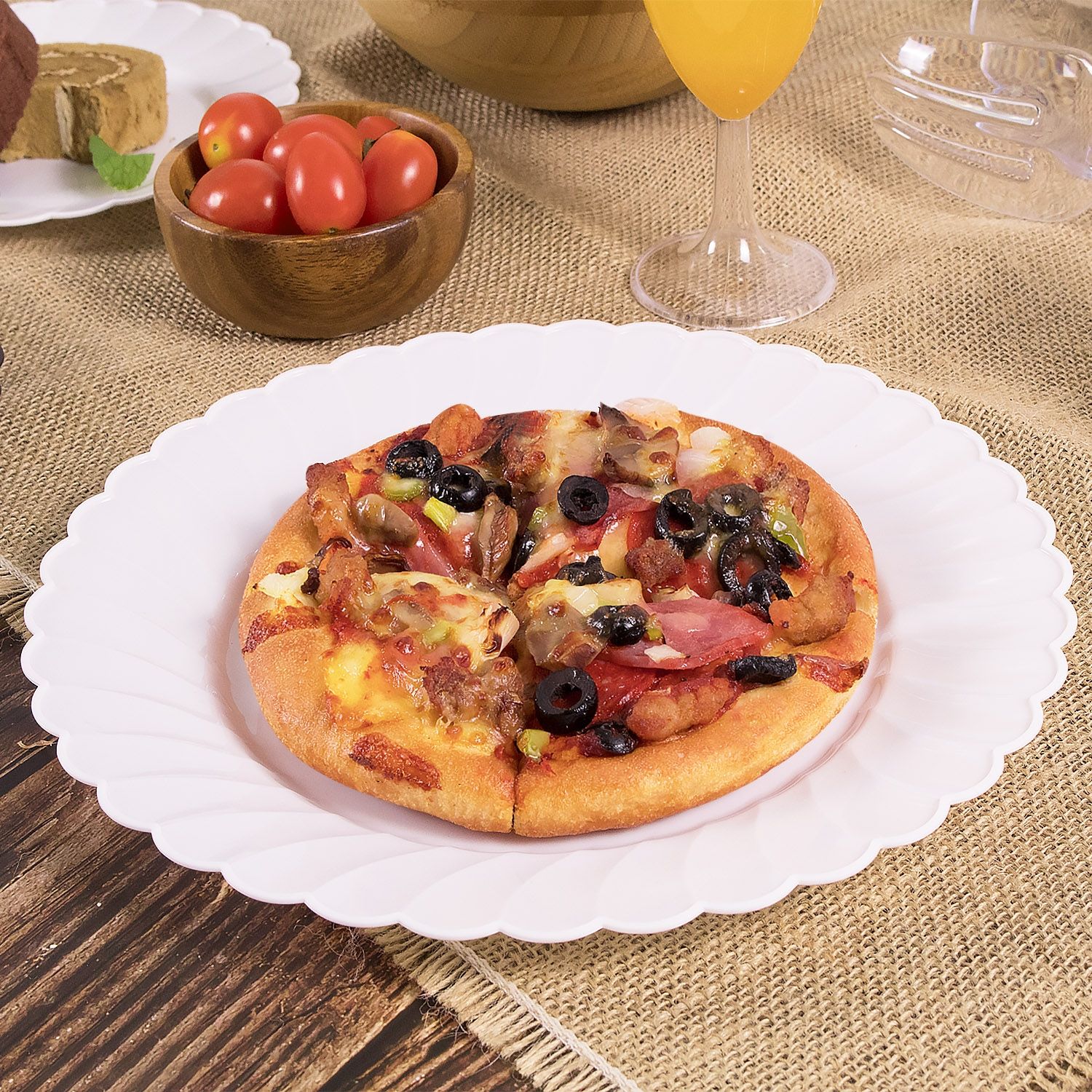 Karat scalloped PS plastic plates are a sturdy option for serving delicious appetizers, entrees and desserts. These plates are perfect for catering special events, including parties, banquets and much more.