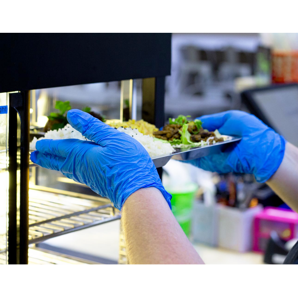 Nitrile Gloves contain no latex and are powder-free. Having the highest level of touch sensitivity due to the glove's ability to mold to your hand for a good fit, our nitrile gloves are good to wear for an extended amount of time. Of the four material types of gloves we offer, our nitrile gloves are the most puncture resistant and are colored blue to help identify if the glove has been punctured. These gloves are intended for food preparation purposes.