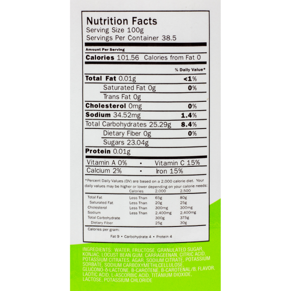 Water, Fructose, Granulated Sugar, Konjac, Locust Bean Gum, Carrageenan, Citric Acid, Potassium Citrates, Agar, Sodium Citrate, Potassium Sorbate, Sodium Carboxymethylcellulose, Glucono-Lactone, B-Carotene, B-Carotenal, Flavor, Lactic Acid, L-Ascorbic Acid, Titanium Dioxide, Lactose, Potassium Chloride