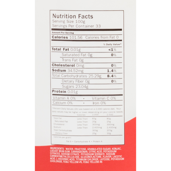 Water, Fructose, Granulated Sugar, Konjac, Locust Bean Gum, Carrageenan, Citric Acid, Potassium Citrates, Sodium Citrate, Potassium Sorbate, Sodium Carboxymethlcellulose, Gluconolactone, Flavor, Lacotic Acid, L-Ascorbic Acid, Titanium Chloride, Latcose, Potassium Choloride