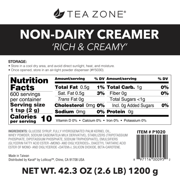 Tea Zone Non-Dairy Creamer "Rich & Creamy" is our original premium powder creamer used as a base for smoothies and milk teas. Tea Zone premium powders are securely sealed and designed to be resealable after opening to maintain the quality of the powder. To ensure uncompromised and sanitary usage, powders should be store in a vacuum sealed power container and always use a dry, clean powder scoop. Packaging design may differ from product photo.