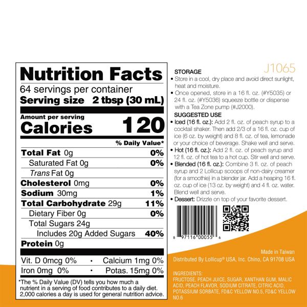Tea Zone Peach Syrup features a sweet and tart flavor derived from real fruit ingredients. The syrup is great for making slushies, smoothies, juices flavored teas, frozen yogurt, shaved ice, and cocktails.
