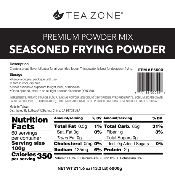 Tea Zone Seasoned Frying Powder contains various ground spices to add flavor to your fried foods. It is commonly used to make Taiwanese popcorn chicken. The frying powder evolves through your cooking process and, depending on what amount you use, its amazing flavor will transcend your dish.